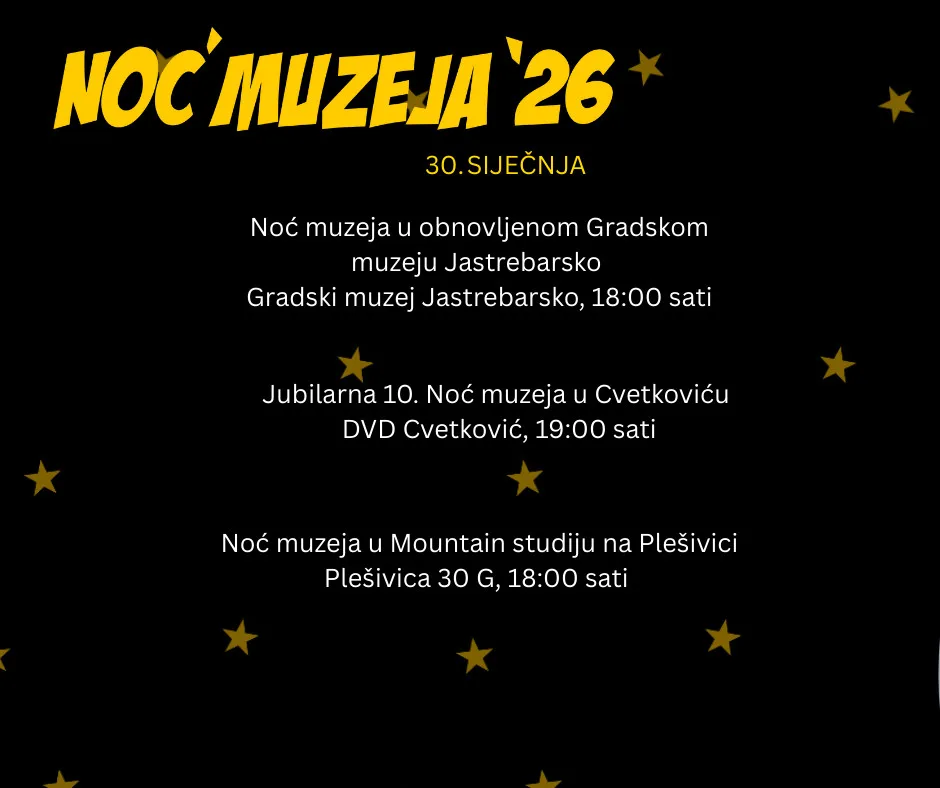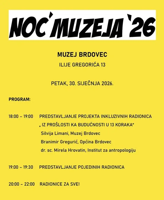 U petak, 30. siječnja 2026., Zagrebačka županija pridružuje se Noći muzeja – manifestaciji koja na jednu večer otvara muzeje, galerije i baštinske prostore široj publici uz posebne programe. Ovogodišnja Noć muzeja je bez određene teme, kao što je bila i u početnim godinama, s ciljem da svim muzejima i galerijama omogući sudjelovanje sukladno njihovim mogućnostima i vlastitom izboru tematike koja ih trenutno zaokuplja. Upravo zato programi u županiji ove godine donose raznolik sadržaj – od digitalnih i tematskih izložbi do vodstava, radionica i otvorenih ateljea.
