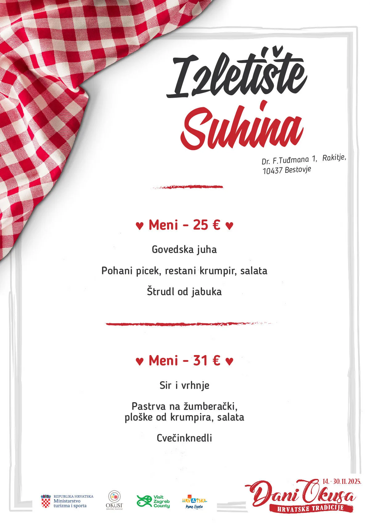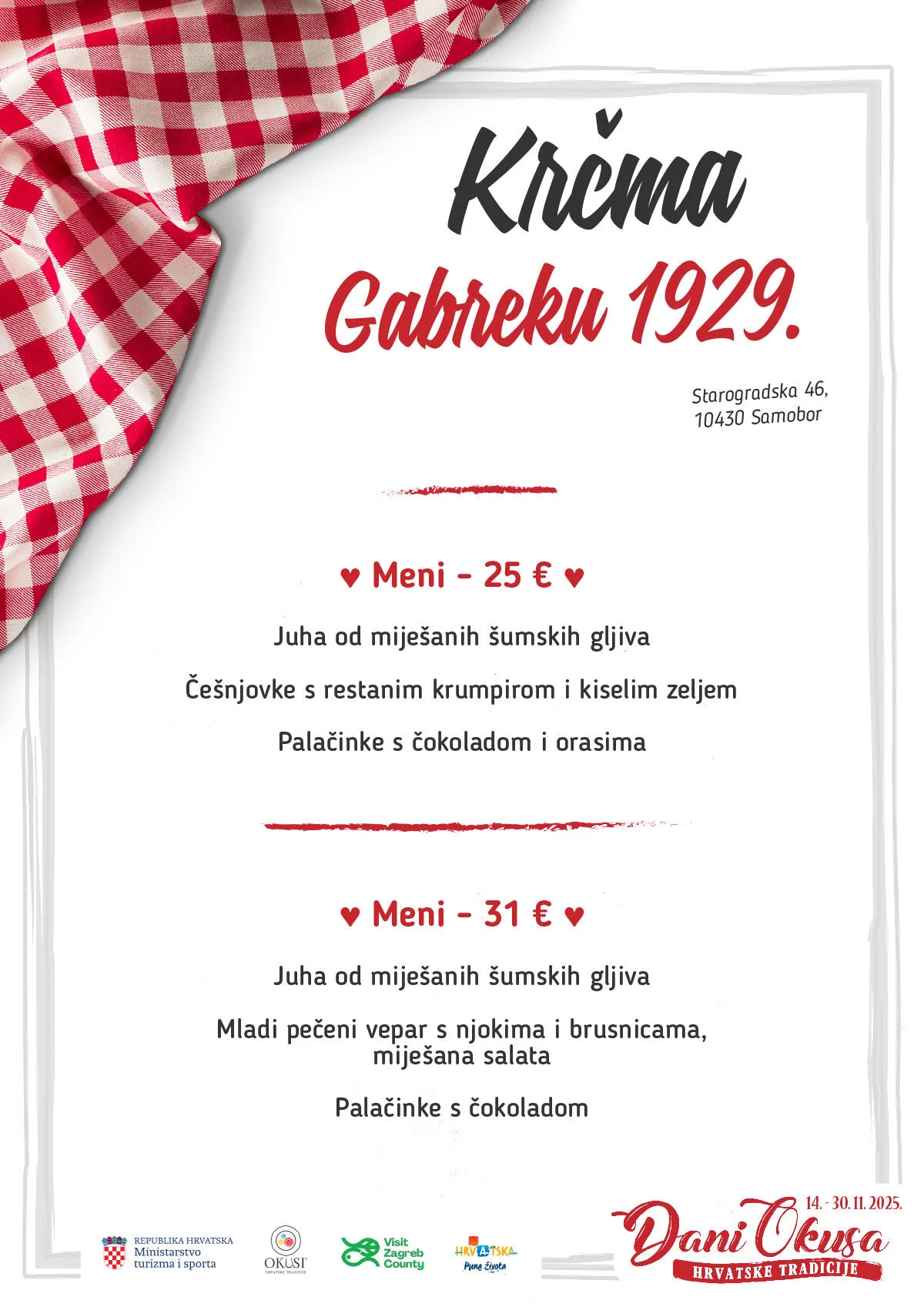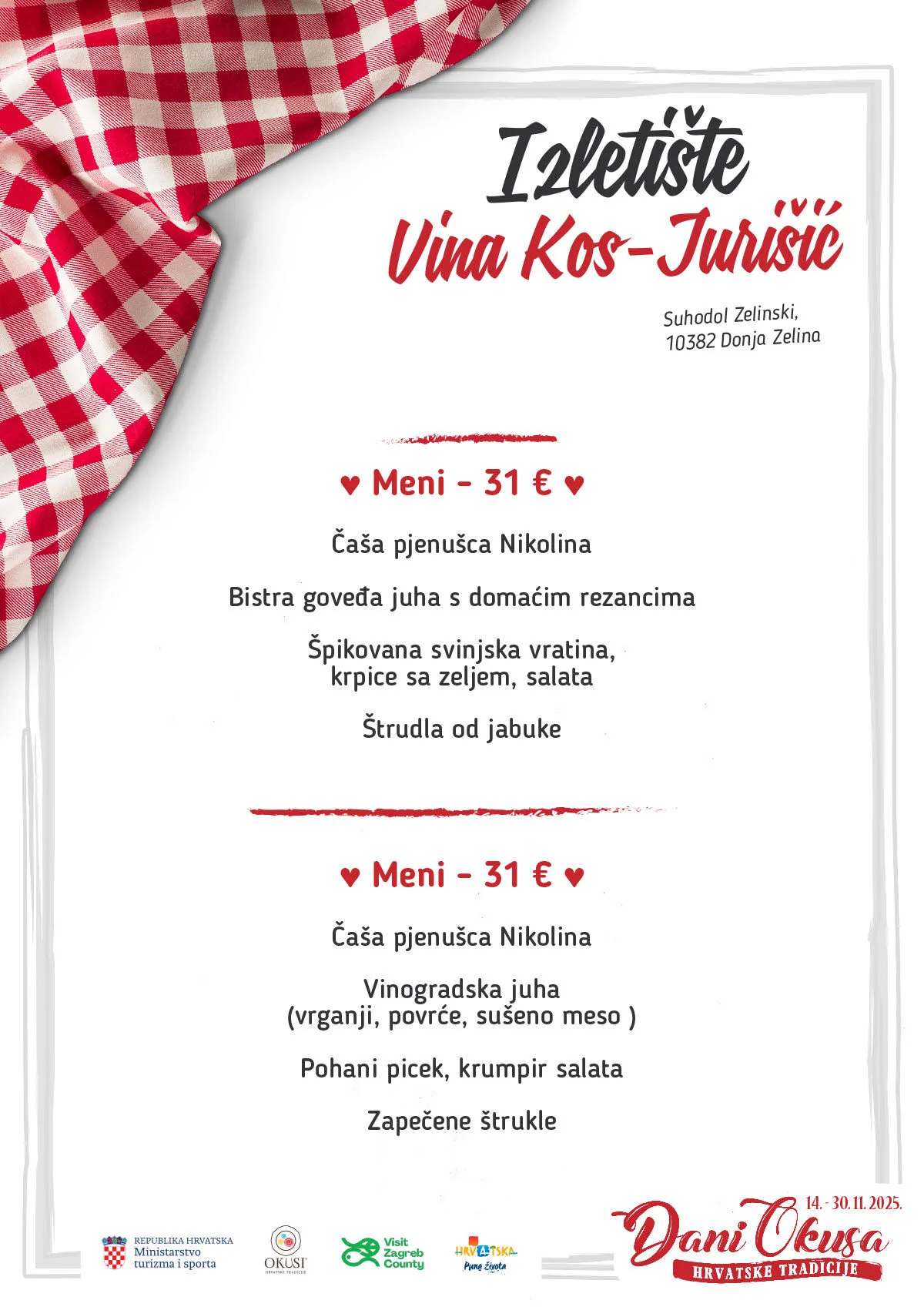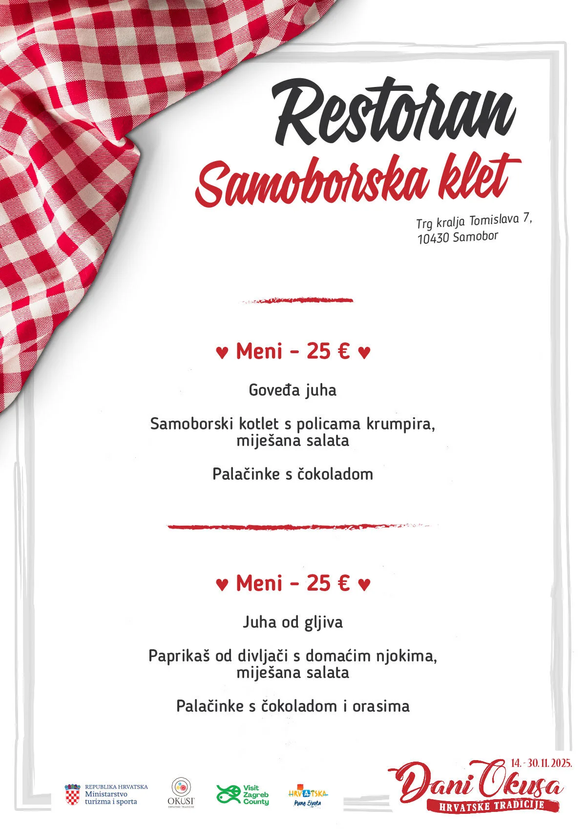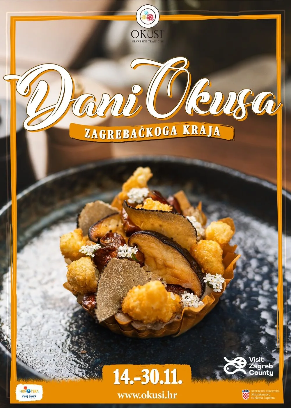 Gastronomska manifestacija „Dani Okusa hrvatske tradicije – Dani Okusa zagrebačkoga kraja“ u Zagrebačkoj županiji trajat će od 14. do 30. studenoga, a pred mnogobrojnim posjetiteljima i ljubiteljima tradicionalne kuhinje naći će se raznolika ponuda jelovnika u deset ugostiteljskih objekata Zagrebačke županije.