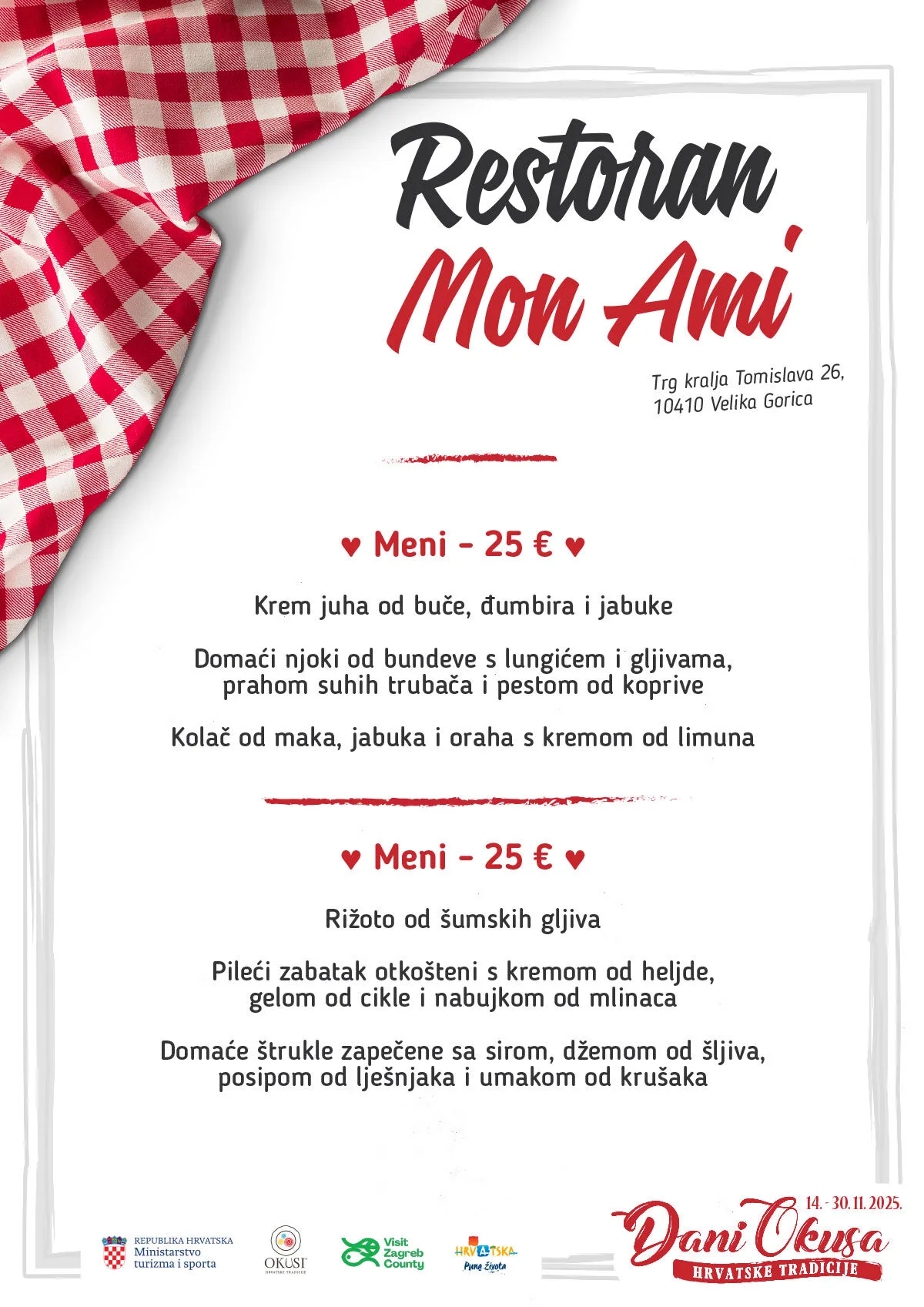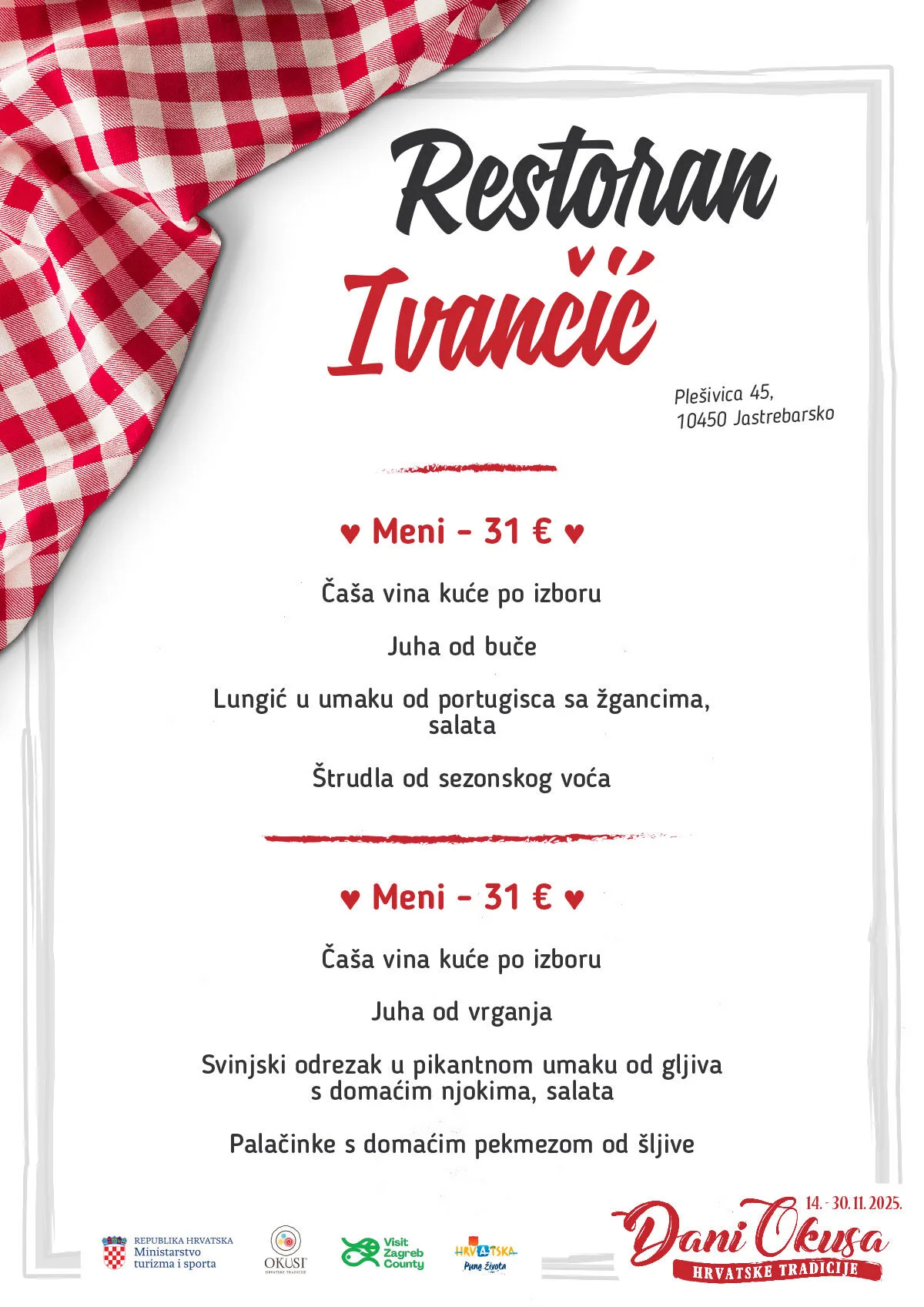 Sedamnaest posebno osmišljenih jelovnika u deset ugostiteljskih objekata mogu se naći po cijenama od 5 eura za slatke zalogaje pa sve do 31 eura za puni jelovnik od tri slijeda uparen s odgovarajućom vinskom ponudom. U ponudi su jela temeljena na lokalnim namirnicama i tradicijskim receptima, među kojima se ističu juha od šumskih gljiva, sporo pečena baby teleća koljenica, obrazi turopoljske svinje, mladi pečeni vepar s njokima i brusnicama, lungić u umaku od portugisca, špikana svinjska vratina te pastrva na žumberački. Posebno mjesto zauzimaju domaći deserti, od Dugoselske torte i doboša do štrudli i zapečenih štrukli.
